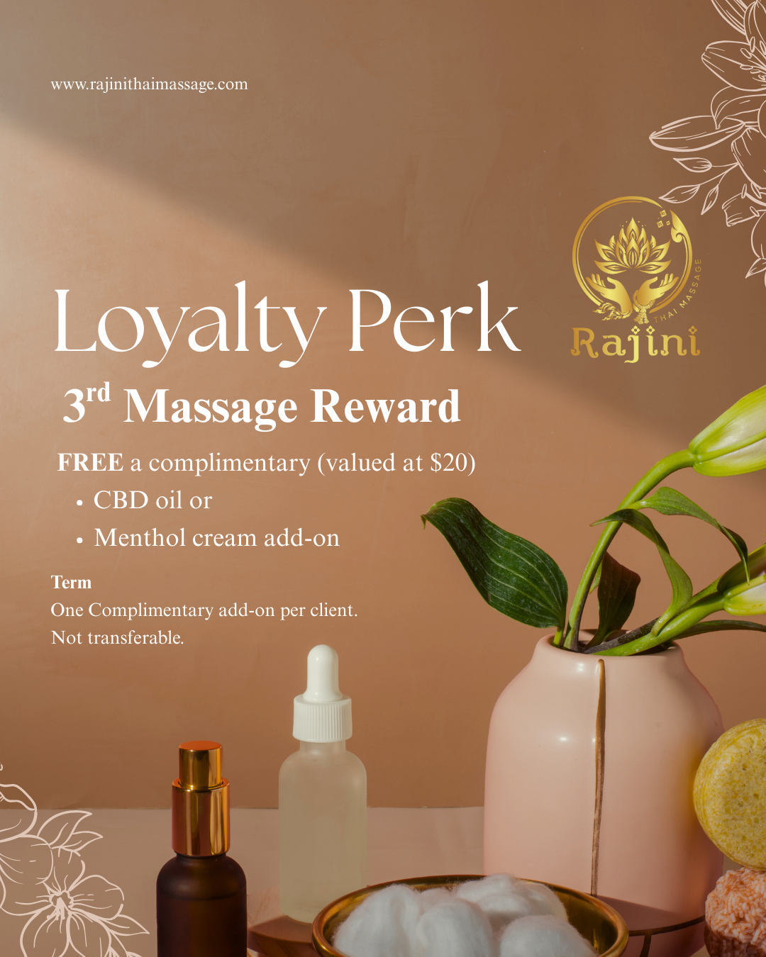 Loyalty Perk: Enjoy a FREE CBD oil or menthol cream add-on with your 3rd massage (Valued at $20)